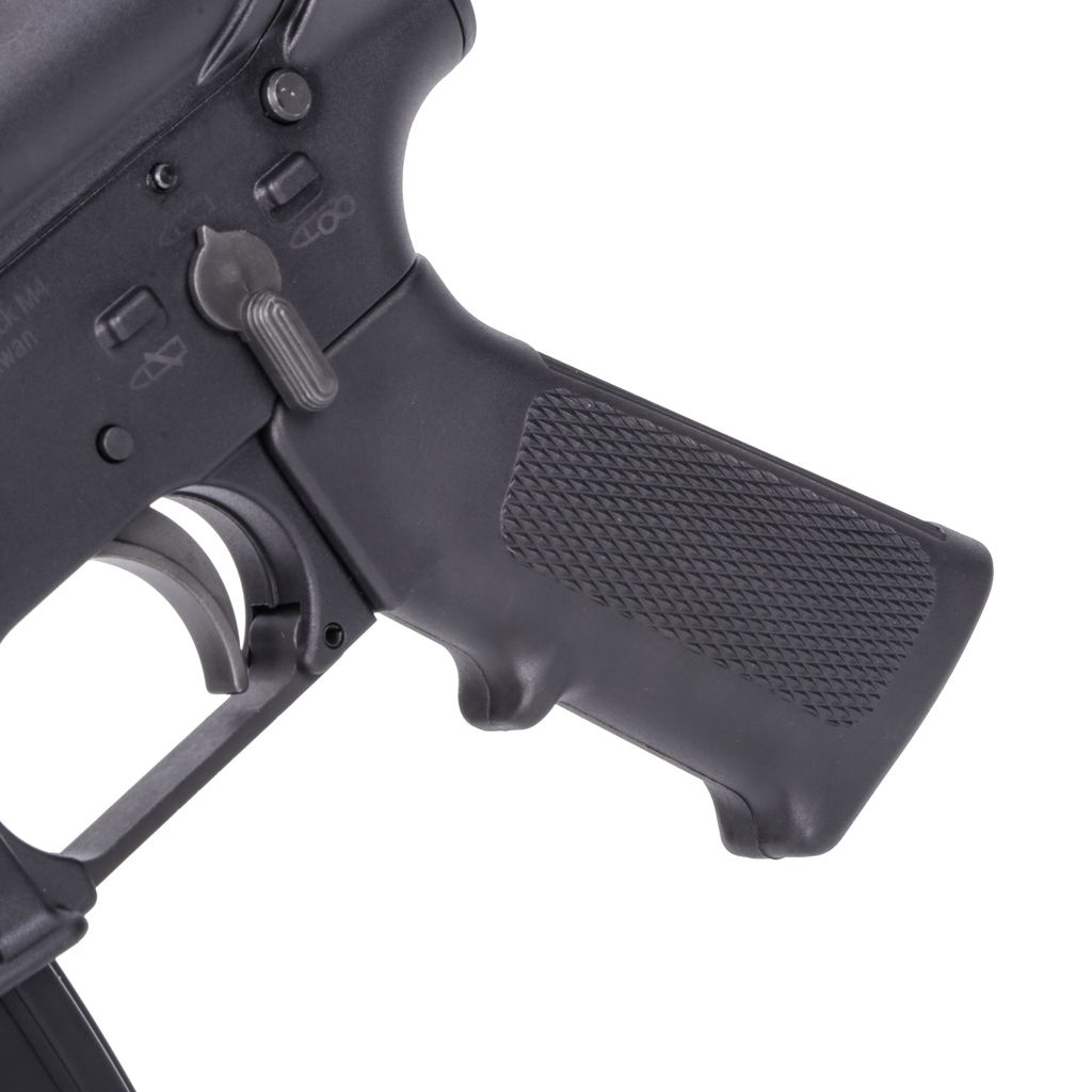 - The metal bolt catch, selector lever, trigger, and charging handle enhance the gun's durability.